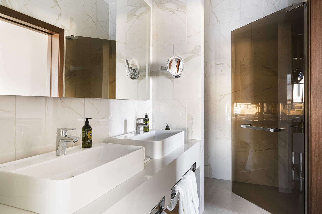 En ce qui concerne les revêtements céramiques, Iris Ceramica, avec d’autres marques de la holding, a été choisie pour son grès cérame aux caractéristiques reconnues de résistance, de durabilité et d’esthétique prestigieuse. Le luxueux spa se trouvant au sous-sol de l’ancien quartier général des télécommunications (comprenant un espace thermal, un sauna et des bains de vapeur, des cabines pour les massages et les traitements bien-être) a été revêtu avec la collection Pietra Basalto dans le format 120x60 cm. Appliquée au sol, elle est appréciée en raison de sa basse réflectivité et du sentiment naturel et harmonieux qu’elle exprime. Le même matériau céramique, sélectionné dans des tons doux et accueillants, se retrouve sur le sol des salles de bain des chambres et dans le hall d’entrée.